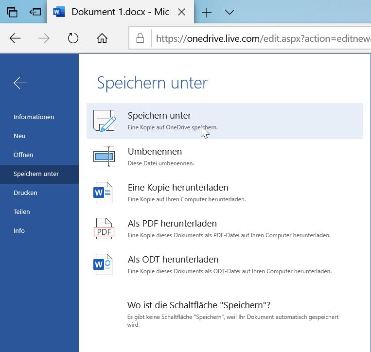 - Die mit den Web-Apps erstellten Dokumente werden in OneDrive gespeichert, können aber auch lokal heruntergeladen werden.