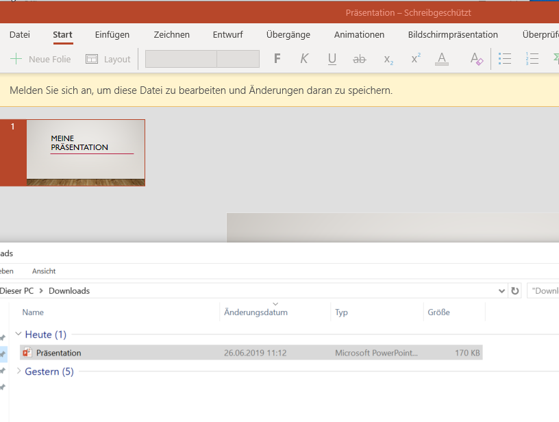 Lokale Dateien wie beispielsweise eine erstellte PowerPoint-Präsentation, welche Sie von einem Kollegen per Mail oder auf einem Stick erhalten haben, können Sie in den Web-Apps über die Funktion „hochladen“ im Online-Office öffnen oder über OneDrive auf die Datei zugreifen, wenn Sie diese zuvor dort abgelegt haben.