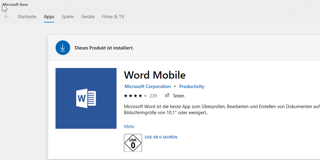Sie können die Office-App, sollte sich diese nicht auf Ihrem System befinden, über den Microsoft Store kostenlos herunterladen.