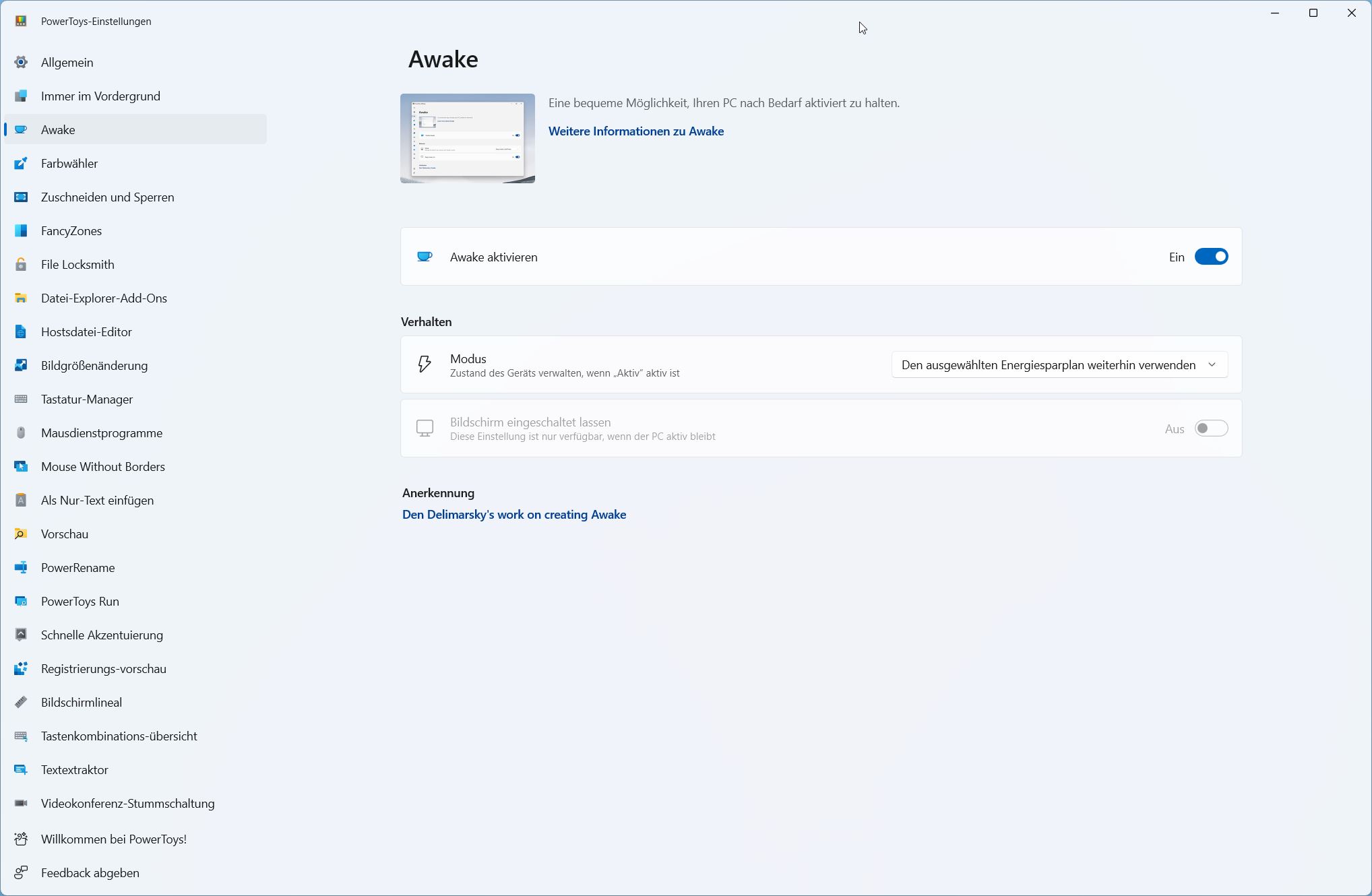 Hinter „Awake“ verbirgt sich eine einfache Möglichkeit, den Ruhezustand oder andere Energiesparpläne zu verhindern, die nach einer bestimmten Zeit oder Benutzerinteraktion aktiviert werden. Dies ist nützlich, wenn Sie z. B. eine große Datei hoch- oder herunterladen oder auf andere Weise verhindern möchten, dass der PC in den Ruhezustand wechselt.