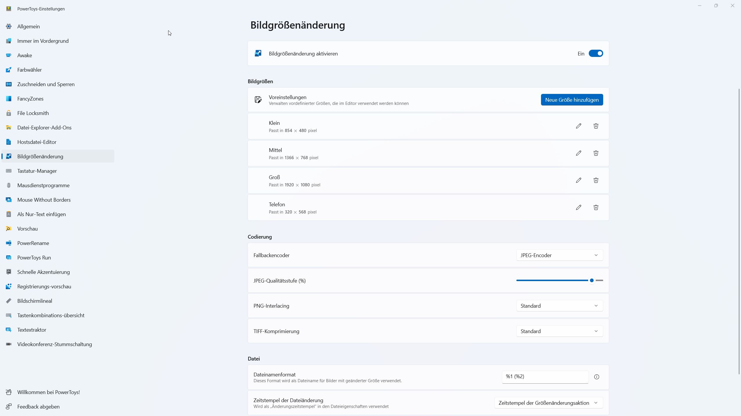 In den Einstellungen der PowerToys können sie weitere Bildgrößen als Voreinstellungen hinzufügen, Parameter für die Neucodierung festlegen und das Dateinamenformat anpassen, welches für geänderte Bilder verwendet wird.