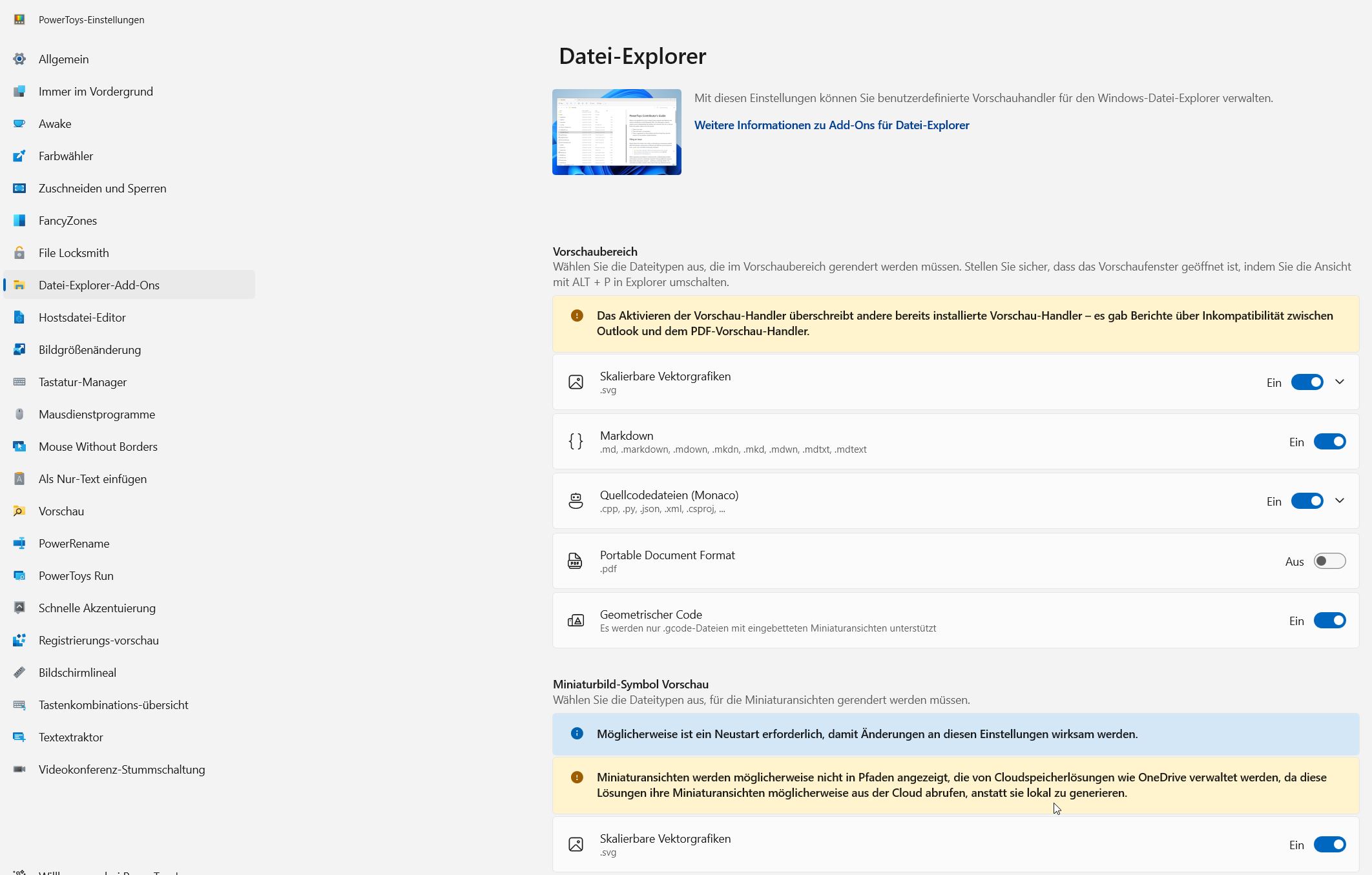 Spannend ist damit vor allem die PDF-Vorschau. Wichtig: Sie kann aber zu Problemen mit Outlook führen, wie bereits in den PowerToys gewarnt wird.