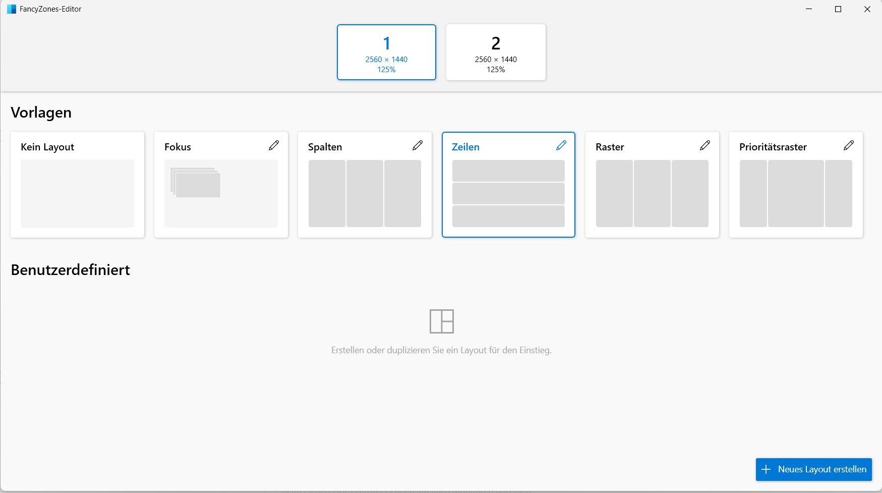 Mit der Tastenkombination WIN+UMSCHALT+Ö können Sie den Layout-Editor starten, welcher eine Auswahl bereits vorgefertigter Layouts anzeigt und darüber hinaus auch die Erstellung eigener Layouts erlaubt. Wählen Sie für jeden Bildschirm ein gewünschtes Layout aus.