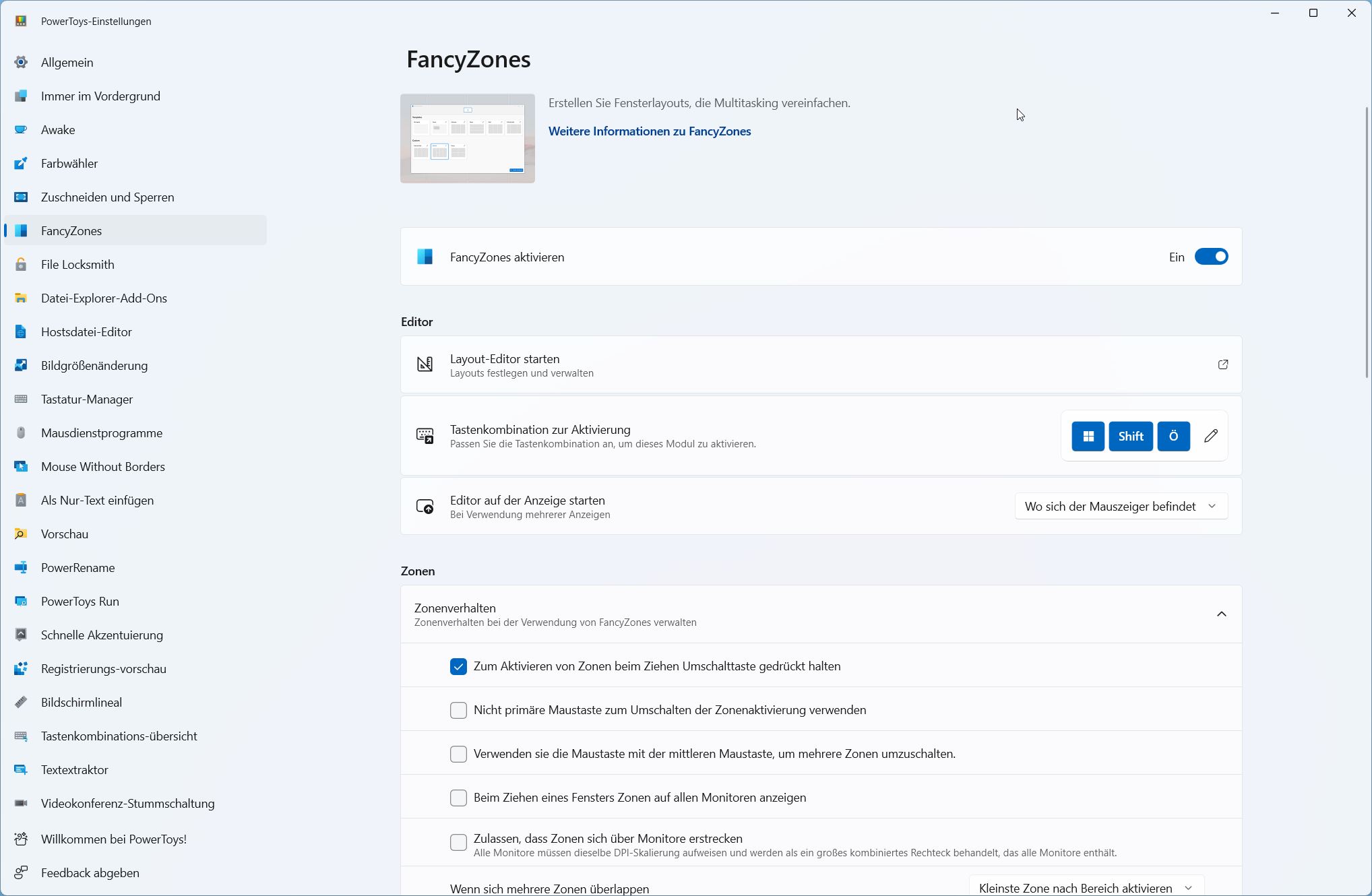 Das weitere Verhalten der Zonen können Sie noch den eigenen Wünschen anpassen – Sie können u.a. Apps für „FancyZones“ ausschließen.