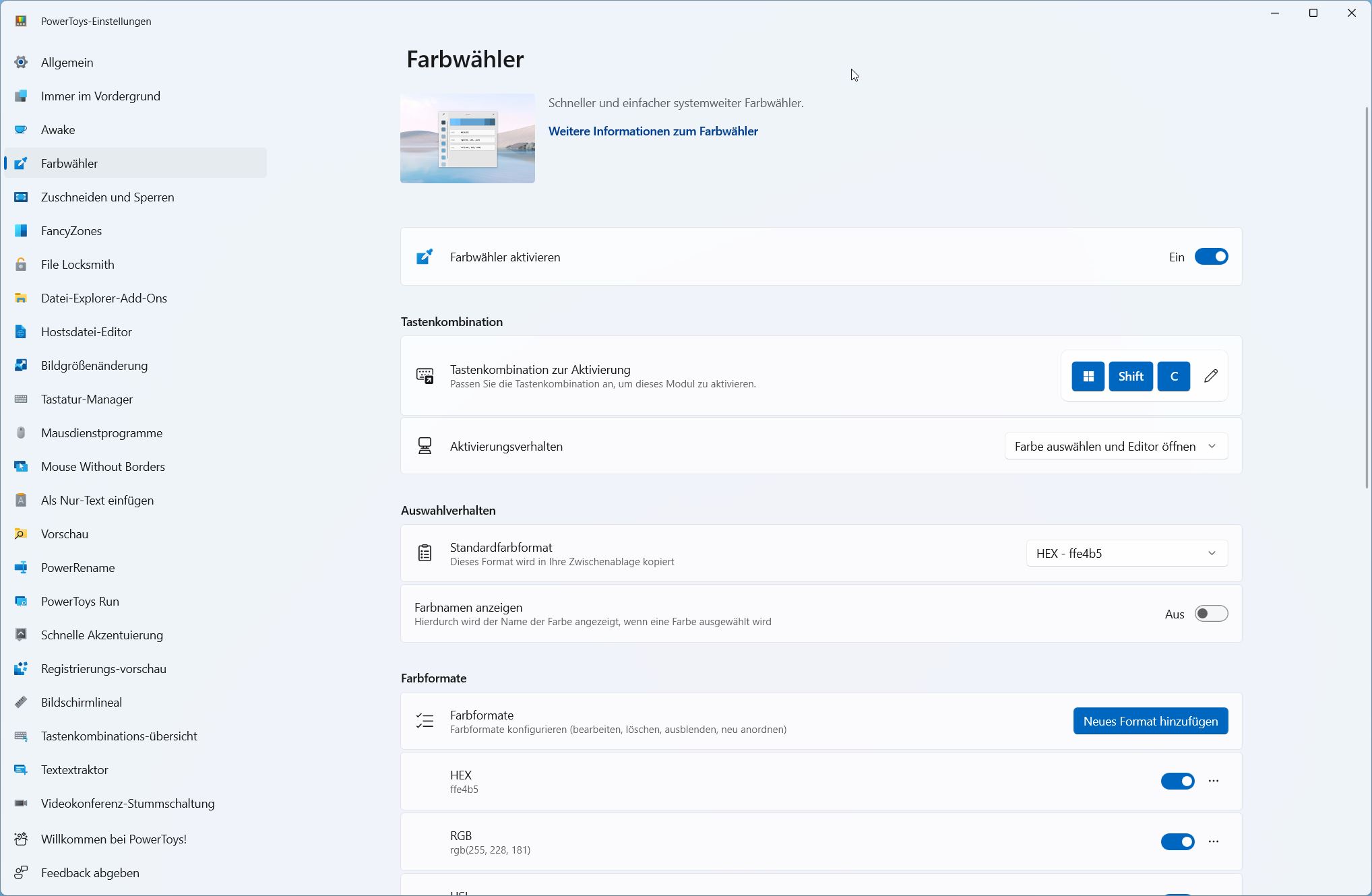 Der „Farbwähler“ ist eine einfache Pipette, mit der Farbinformationen der aktuellen Mausposition auf dem Bildschirm erfasst werden können. Die Werte werden in den Formaten HEX, RGB und HSL ausgegeben. In den Einstellungen können auch andere Farbformate wie CMYK, HSB, Dezimal und Ähnliches gewählt werden.