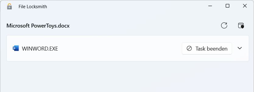 „File Locksmith“ zeigt Ihnen dann das Programm oder den Prozess an, welcher auf die Datei zugreift und bietet die Möglichkeit, den Task zu beenden.