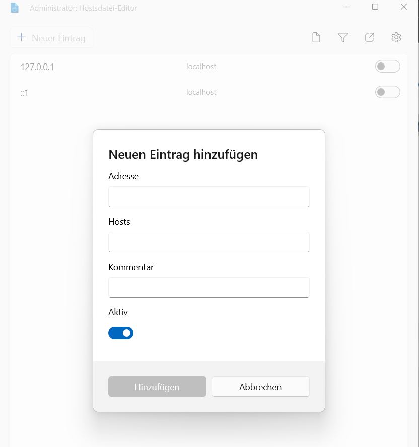 Der Hosts-Datei-Editor bietet eine komfortable Möglichkeit, neue Einträge in die Hosts-Datei einzufügen oder bestehende Einträge zu bearbeiten. Einträge können auch deaktiviert oder gelöscht werden.