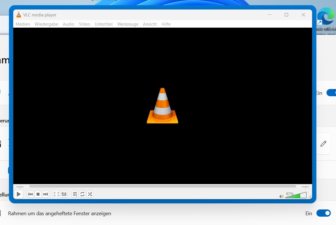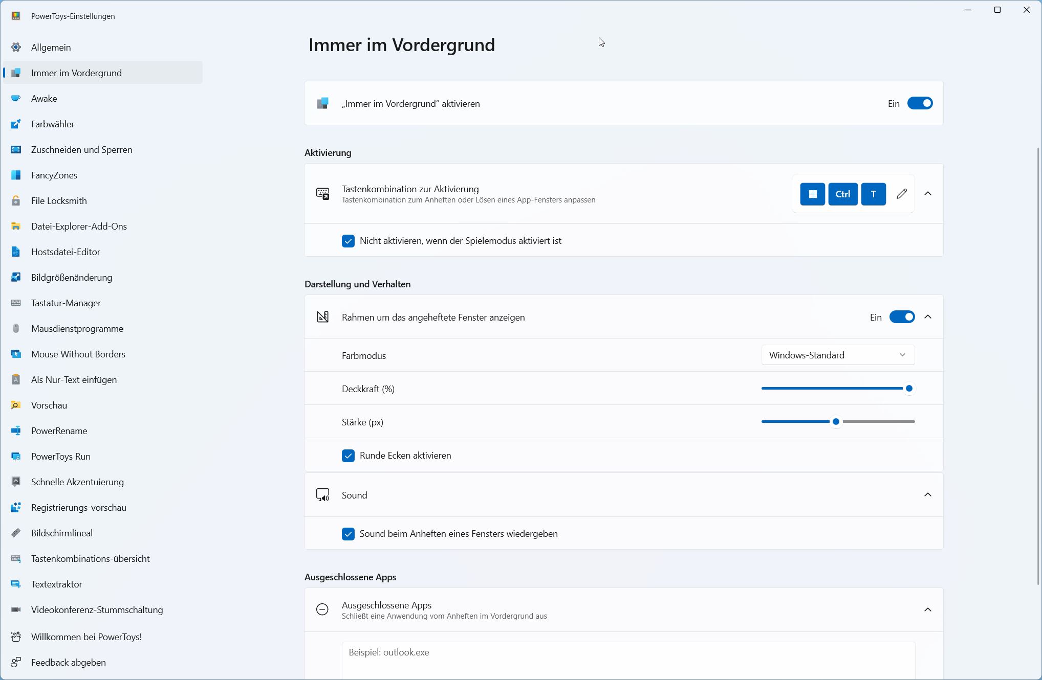 Darunter können Sie festlegen, ob die Aktivierung auch im Spielemodus von Windows möglich sein soll. Die Funktion ermöglicht es auch, die so markierten Fenster optisch anders darzustellen. Dies können Sie im Abschnitt „Darstellung und Verhalten“ Ihren Wünschen anpassen. Standardmäßig wird ein angeheftetes Fenster mit einem blauen Rahmen markiert.