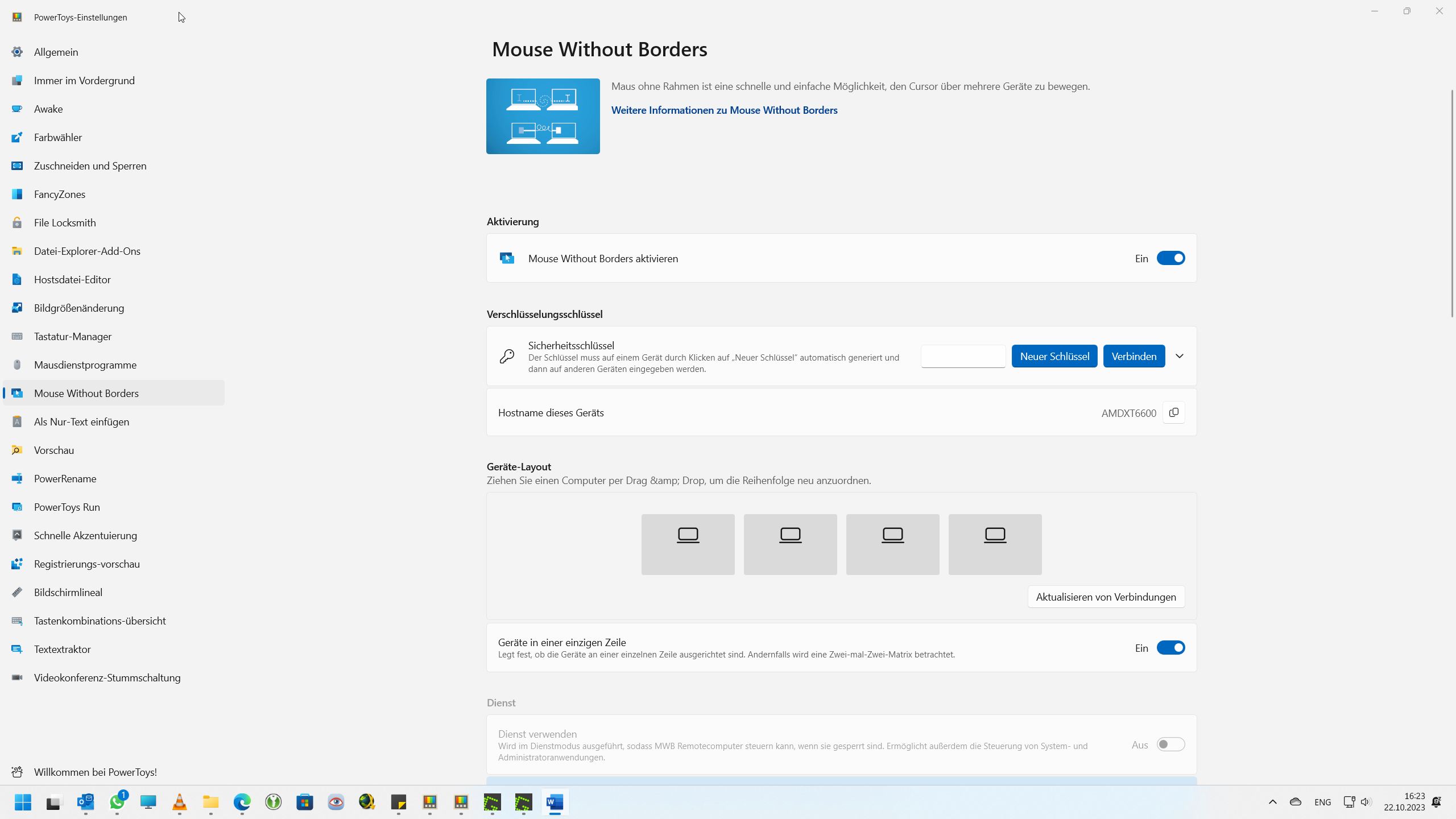 „Mouse Without Borders“ ist vor allem für Anwender interessant, die mehrere PCs gleichzeitig nutzen und dafür nur eine Maus verwenden wollen. Dazu muss diese Erweiterung auf allen PCs installiert und aktiviert werden. Die PCs müssen sich im selben Netzwerk befinden. Ein gemeinsamer Sicherheitsschlüssel sorgt dafür, dass die Maus zwischen den PCs verwendet werden kann. Sie können die Anordnung der Geräte anpassen, z.B. wenn die Monitore nebeneinander oder einige übereinander stehen.