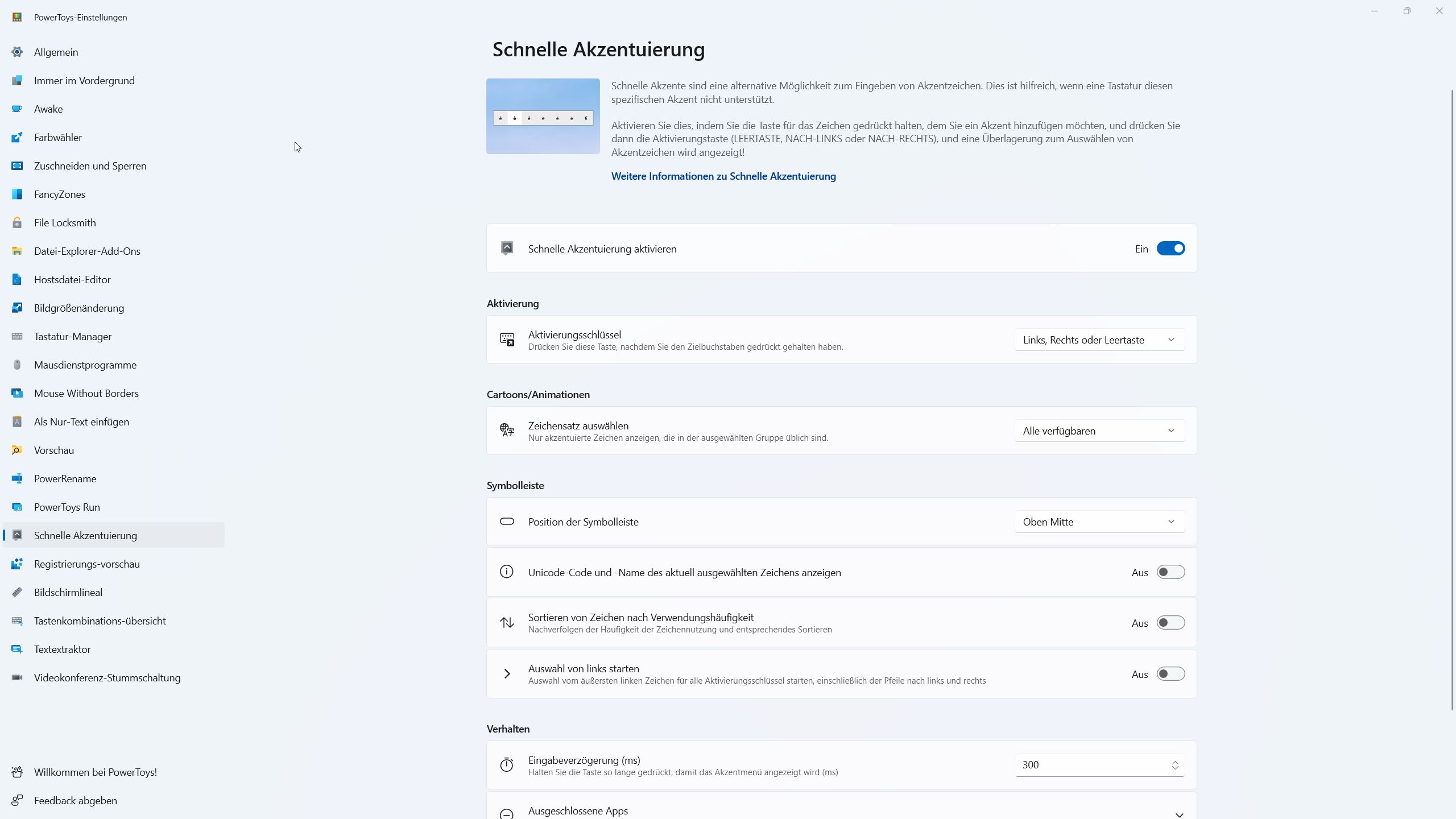 Um die Akzentleiste zu aktivieren, drücken Sie zuerst den Buchstaben und dann die Links-, Rechts- oder Leertaste. Die PowerToys zeigen dann eine Akzentleiste an, aus der Sie den gewünschten Akzent auswählen können.
