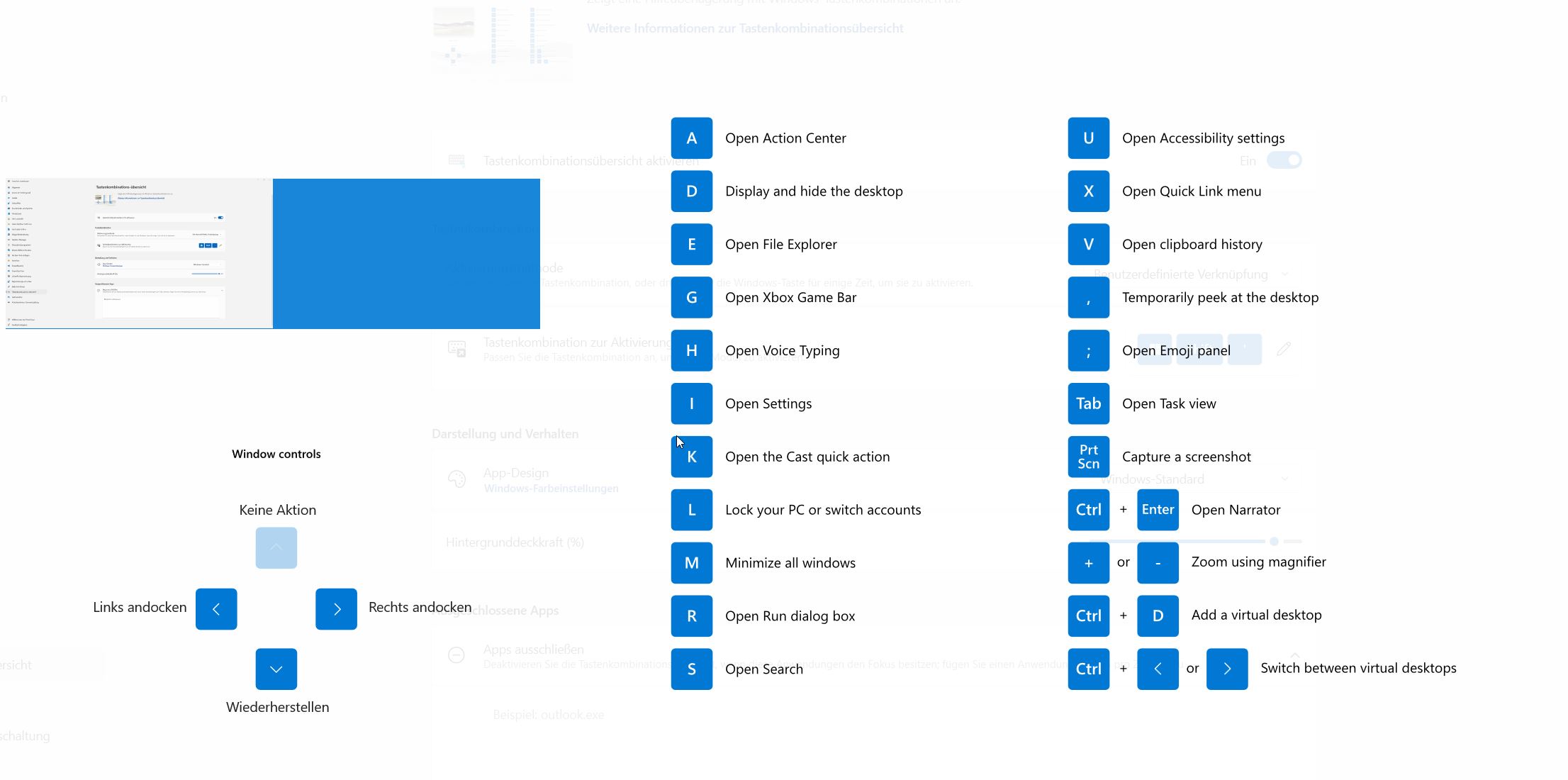 Hinter dieser Funktion, welche mit der Tastenkombination WIN+UMSCHALT+Hochkomma aktiviert wird, blendet Windows die wichtigsten Tastenkombinationen der WIN-Taste ein.