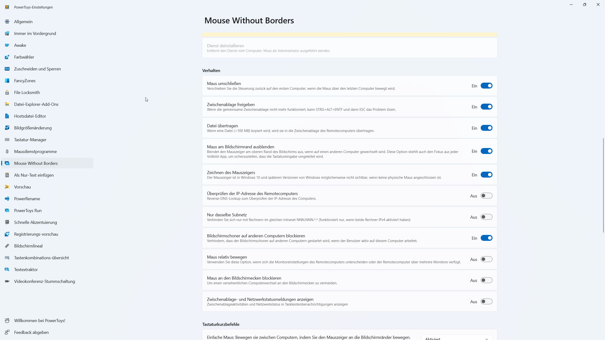 Das Verhalten der Funktion kann weiter angepasst werden, z.B. eine gemeinsame Zwischenablage zwischen den PCs, eine Übertragung von Dateien über die Zwischenablage, die Beschränkung auf das gleiche Subnetz und vieles mehr.
