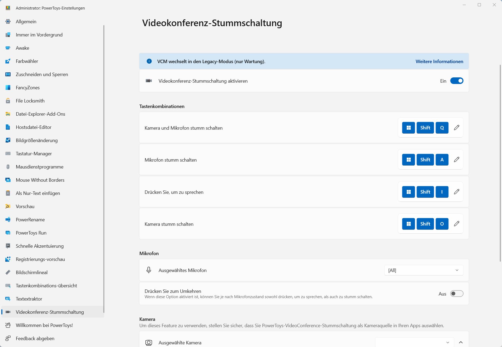 Mit der „Videokoferenz-Stummschaltung“ stehen Ihnen mehrere Tastenkombinationen zur Verfügung, um Kamera und Mikrofon stumm zu schalten, nur das Mikrofon stumm zu schalten oder das Sprechen mit dem Drücken einer Taste zu unterdrücken bzw. die Kamera stumm zu schalten. Für welches Mikrofon und welche Kamera die Vorgaben gelten, können Sie genauso wie die Tastenkombinationen anpassen.