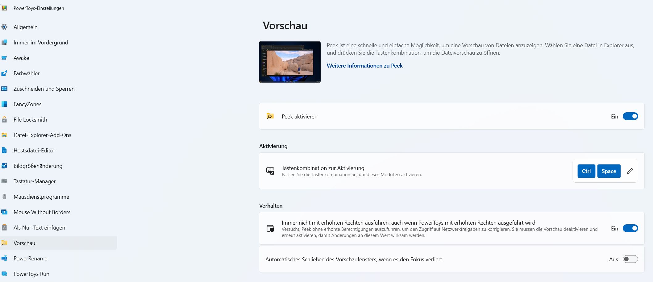Die Vorschau, auch „Peek“ genannt, ist Mac-Usern nicht unbekannt, in Windows ohne die PowerToys aber bisher nicht implementiert. Für eine Vorschau wählen Sie eine Datei im Explorer aus und drücken dann STRG+Leertaste.