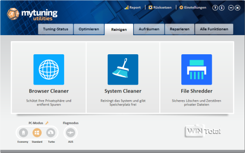 Das Produktmanagement von S.A.D. stellt mit dem Unternehmen Beanox eine neue Tuning-Software vor. Nach einer kurzen Beta-Phase wurde mytuning utilities im April 2015 veröffentlicht. Die schlanke und einfach zu bedienende Software erinnert etwas an TuneUp Utilities mit den Optionen „Optimieren“, „Reinigen“, „Aufräumen“, „Reparieren“ und den Energie-Modi „Economy“, „Standard“ und „Turbo“. Wir stellen die neue Software etwas ausführlicher vor.