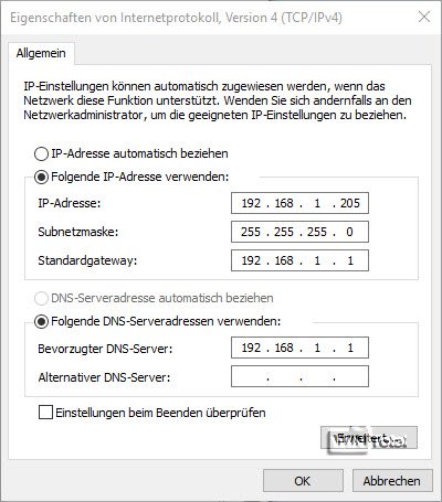 Im folgenden Fenster vergeben Sie nun manuell eine IP-Adresse aus dem Adressraum des Routers und tragen die IP des Routers bei Standardgateway und DNS-Server ein.