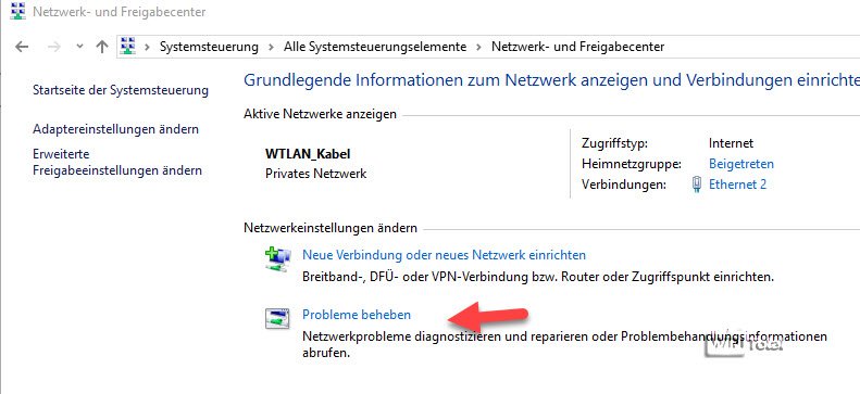 Der gleiche Problemlöser ist auch in Windows 7 oder Windows 8 enthalten, dort in der Systemsteuerung unter Netzwerk- und Freigabecenter als „Probleme beheben“ oder in dem Systemsteuerungselement „Problembehandlung“ versteckt.