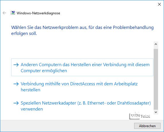 Das Modul Netzwerkproblembehandlung diagnostiziert Netzwerkprobleme und behebt diese selbstständig. Dazu versucht der Assistent erst eine Netzwerk- und eine Internetverbindung herzustellen und – sollte dies nicht klappen – hierbei eventuelle Fehler zu beheben. Ist ein Internetzugriff möglich, können andere Probleme angegeben werden.