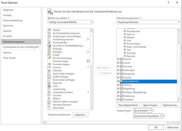 Damit ein Dokument sich als Vorlage eignet, müssen Sie den Inhalt erst als solches anpassen. Für Word beispielsweise sollten Sie Felder wie die Anrede, Betreff und andere Felder in einem Briefkopf oder eigene Rechnung in Excel mit Formularfeldern versehen. Word, Excel und PowerPoint bieten dazu entsprechende Funktionen, wenn Sie zuvor in den Optionen unter Menüband anpassen“ die „Entwicklertools“ aktivieren.