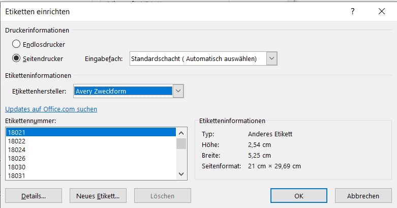 Wenn Sie in das Feld „Etikett“ klicken, haben Sie eine Auswahl von vielen Etikett-Vorlagen, gegliedert nach Hersteller und Etikettennummer.