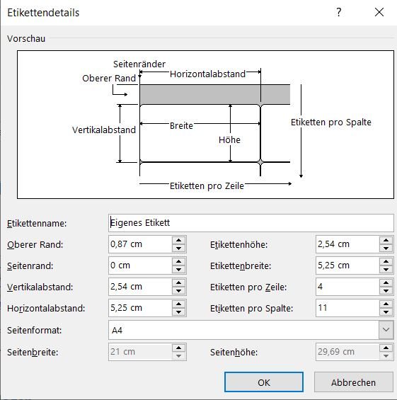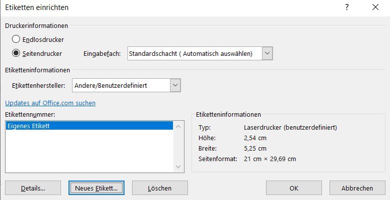 Mit einem Klick auf „OK“ wird das neue Etikett als Vorlage unter „Andere/Benutzerdefiniert“ geführt und kann dann als Layout-Vorlage künftig verwendet werden.