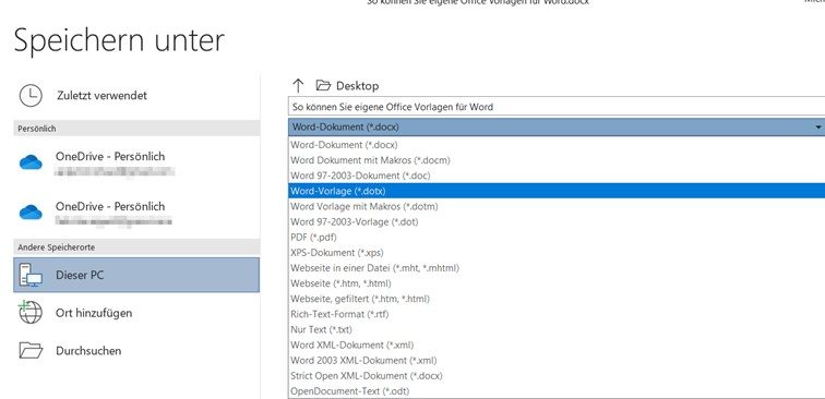 Der entscheidende Schritt in allen Office-Programmen ist dann die Speicherung des Dokuments als Office-Vorlage. Als Dateityp müssen Sie hier Word-Vorlage (*.dotx), Excel-Vorlage (*.xltx) oder PowerPoint-Vorlage (*.pptx) auswählen. Das „t“ steht hier jeweils für Template = Vorlage.
