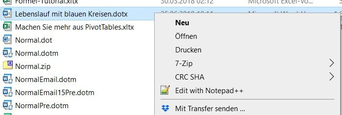 Wenn Sie dagegen die Vorlage editieren möchten, müssen Sie über das Kontextmenü die Funktion „Bearbeiten“ aufrufen. Diese führt dazu, dass kein neues Dokument auf Grundlage der Vorlage, sondern die Vorlage selbst zum Editieren geöffnet wird.