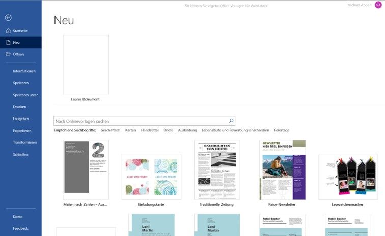 Alle Microsoft Office-Programme bieten eine Auswahl von Vorlagen für viele verschiedene Zwecke. Diese werden Ihnen bei Datei -> Neu immer zuerst angezeigt.