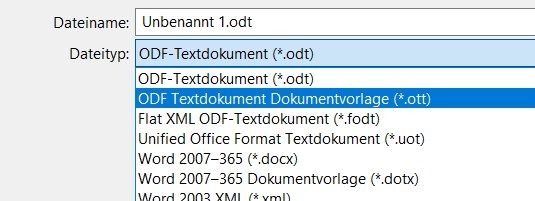 Das freie LibreOffice verwendet für Vorlagen ebenfalls ein eigenes Format, in Writer beispielsweise *.ott für ODF Textdokument Dokumentvorlage.