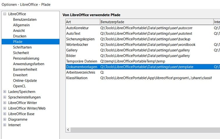 Damit eigene Vorlagen in LibreOffice auch verwendet werden können, müssen diese im Ordner für Dokumentvorlagen gespeichert werden und der Pfad zu den Dokumentvorlagen (Templates) geändert werden. Beides finden Sie unter Extras -> Optionen -> Pfade.