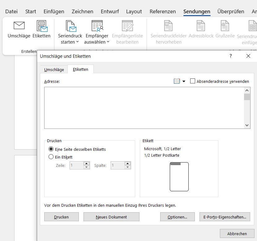 Word bietet für Etiketten eine eigene Vorlagenverwaltung. Sie finden Etikettenvorlagen im Menüband unter Sendungen -> Etiketten.