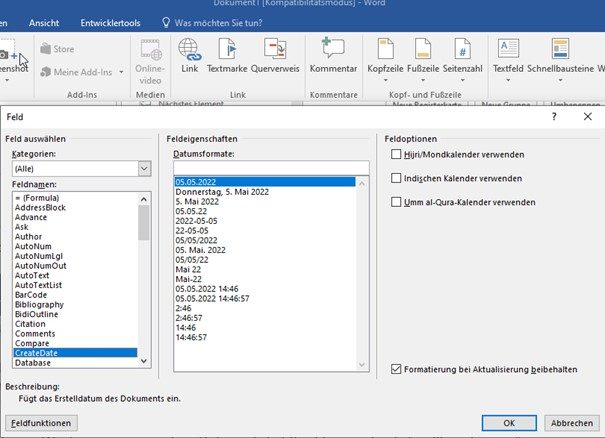 Die Feldfunktion „CreateDate“ sorgt dafür, dass in dem Dokument das Datum der Erstellung des neuen Dokuments verwendet wird und auch bleibt, auch wenn Sie das Dokument später wieder öffnen und nicht das aktuelle Datum stattdessen verwendet wird.
