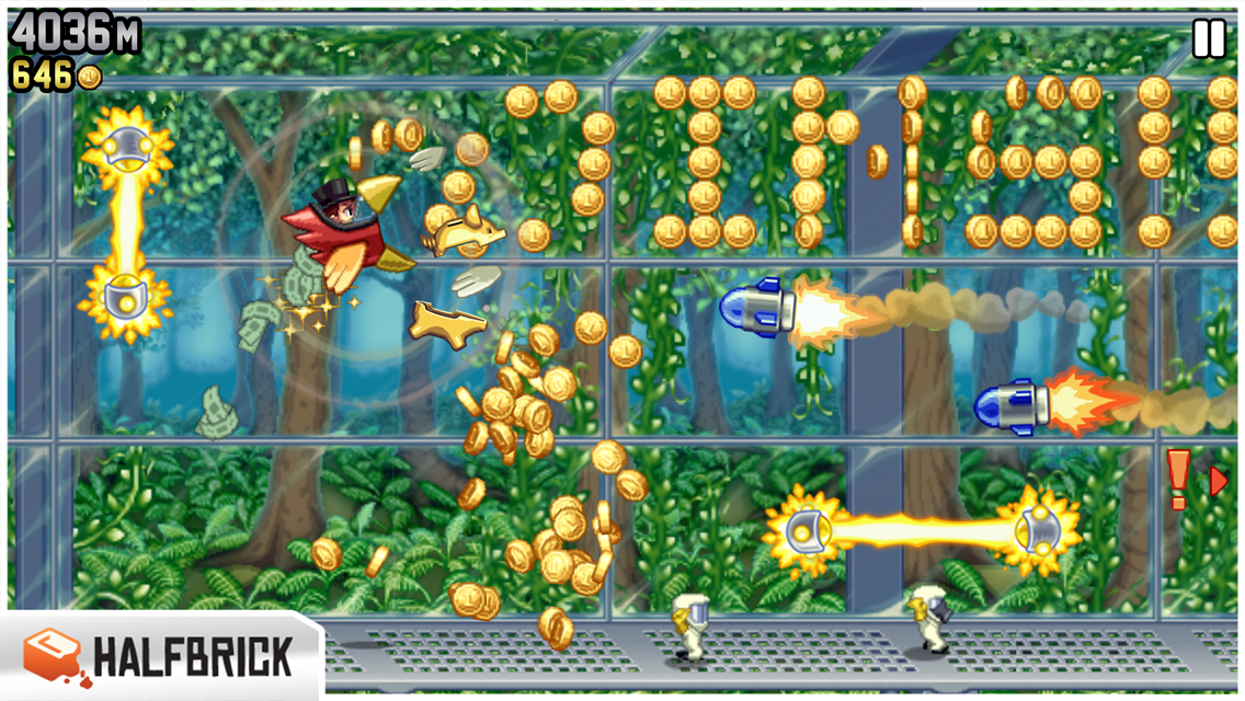 Im lustigen Arcade-Game „Jetpack Joyride“ schlüpfen Sie in die Rolle des erfolglosen Grammophone-Verkäufers Barry, der mit Hilfe eines Jetpacks durch ein Labor schwebt und dabei möglichst viele Münzen einsammeln muss. Dafür müssen Sie ihn an verschiedenen Hindernissen, wie beispielsweise Laserstrahlen, Raketen oder Hochspannungsleitungen, vorbeimanövrieren.
