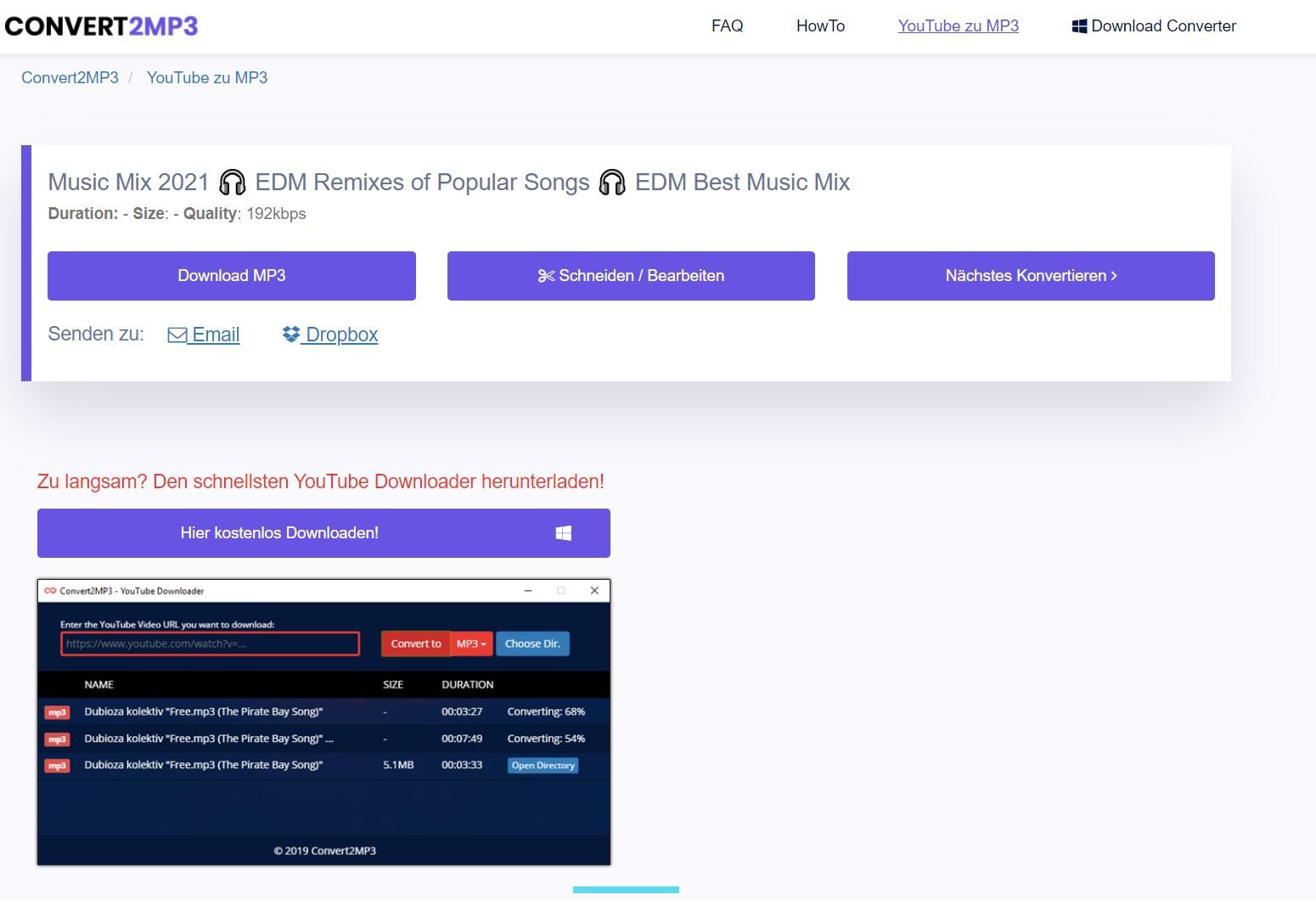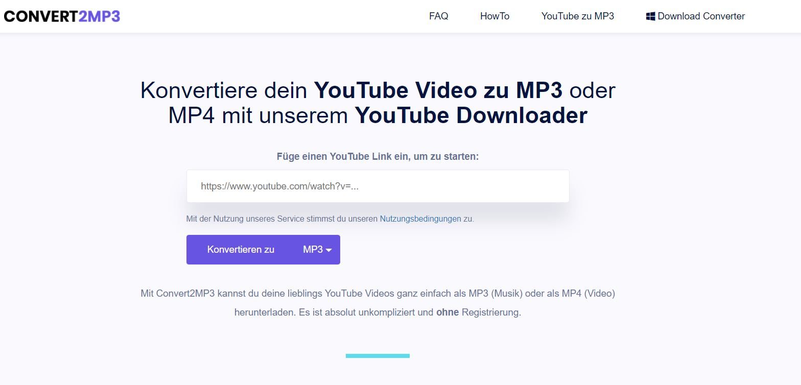 https://convert2mp3.tv/ ist in der Lage, von YouTube-Videos die Musik als MP3 oder als Video im MP4 zu extrahieren. Dazu müssen Sie nur die YouTube-URL in das Eingabefeld kopieren.