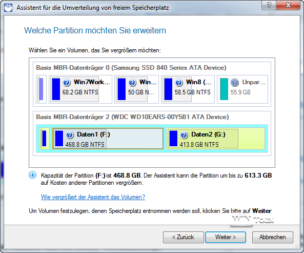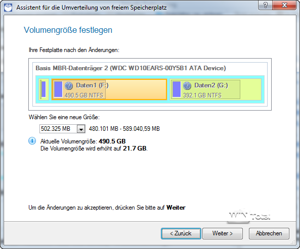 Gegenüber den Vorversionen hat der Hersteller die Assistenten überarbeitet, so dass Aufgaben wie die Umverteilung von freiem Speicherplatz sehr unkompliziert und interaktiv möglich sind, indem der Anwender einfach mit der Maus die Grenze zwischen zwei Partitionen verschiebt.
