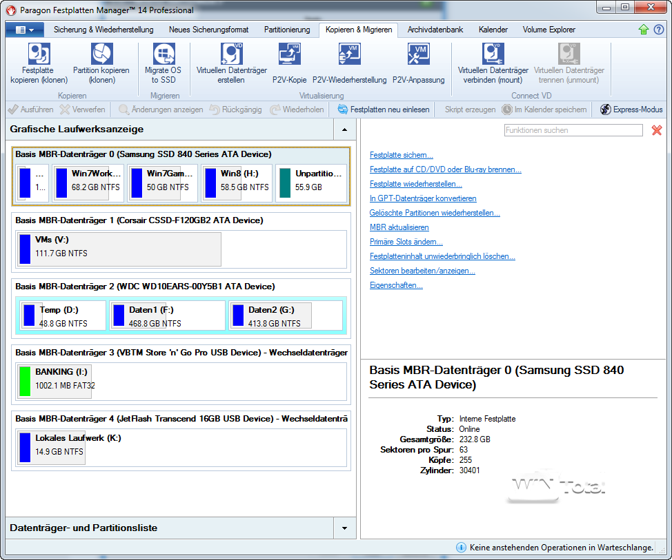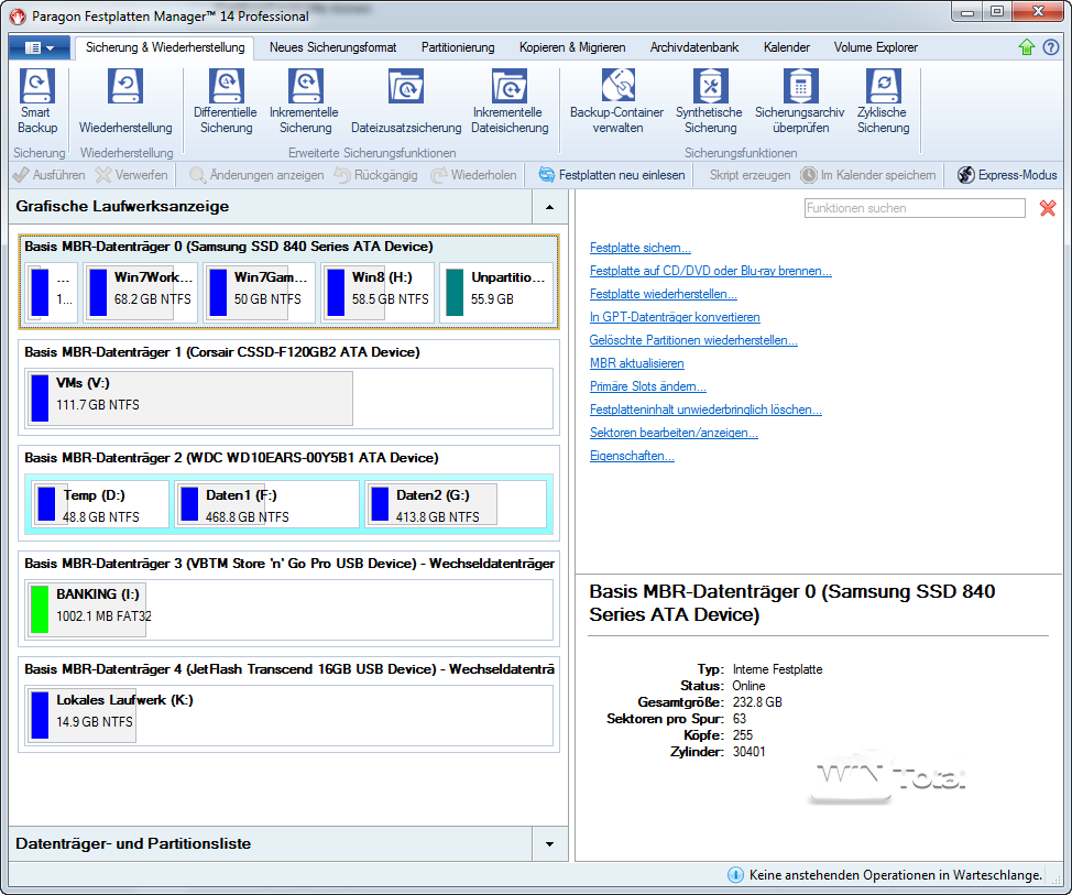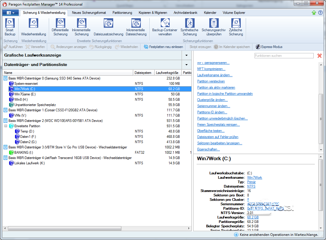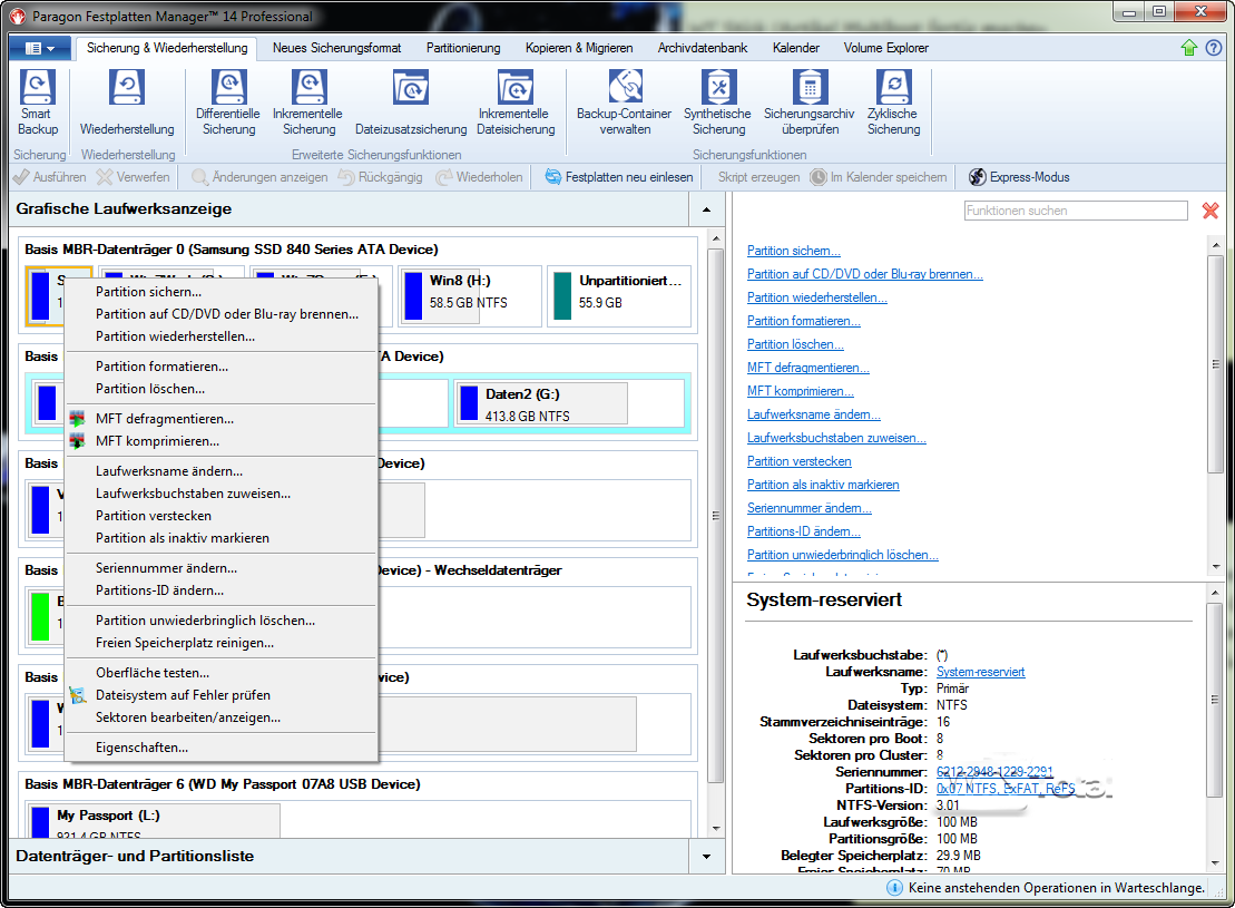 Im linken Bereich werden die Datenträger mit den Partitionen angezeigt, im rechten Bereich gibt es eine Auswahl der möglichen Funktionen. Datenträger und Partitionen bieten über das Kontextmenü weitere Funktionen.