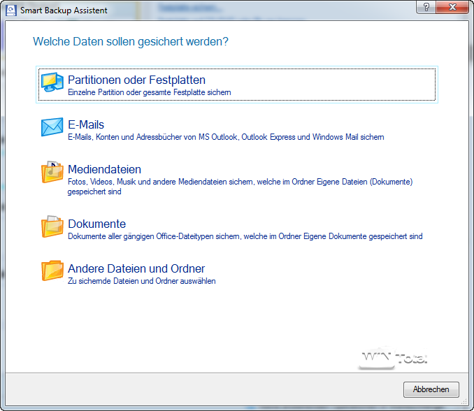 Der Smart Backup Assistent führt den Anwender durch die vielen Funktionen, indem er nach Sicherungsziel und -art alle wesentlichen Punkte abfragt. Die Funktion zur Sicherung von E-Mails berücksichtigt leider nicht den weit verbreiteten Mail-Client Thunderbird, wohl aber Microsoft Outlook, Windows Mail und Outlook Express.