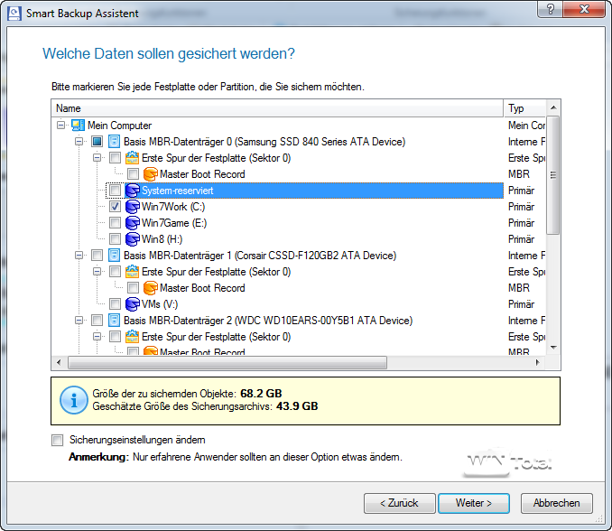 Wählt man eine Festplatte oder Partition zur Sicherung, wird automatisch die Image-Sicherung aktiv.
