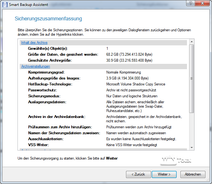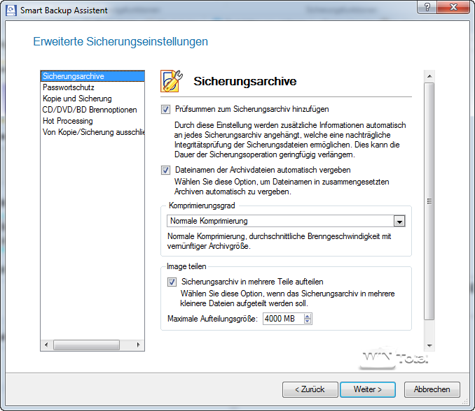 Die Sicherungseinstellungen können vom Anwender zu Anfang aber auch noch angepasst werden, z.B. kann er den Grad der Komprimierung oder einen Passwortschutz festlegen.