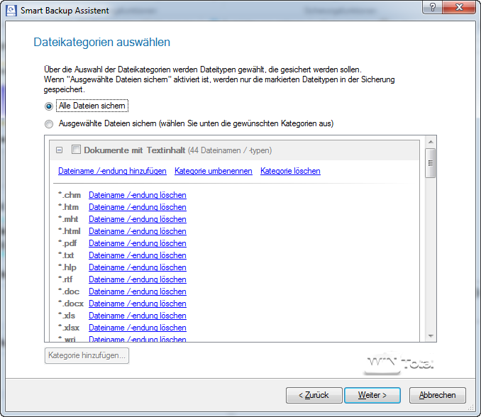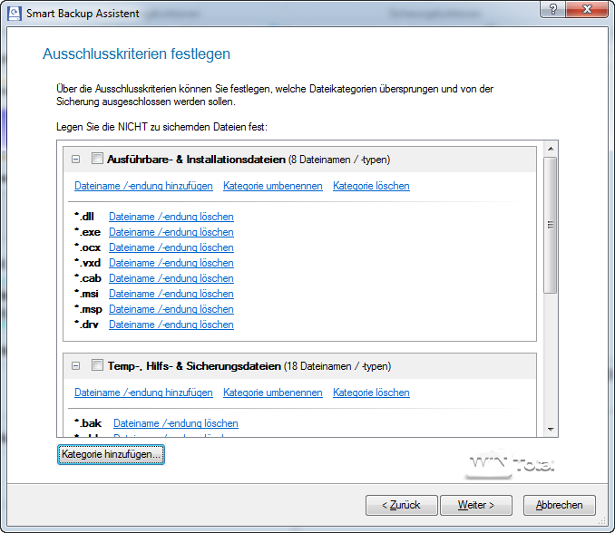 Sollen statt Festplatten und Partitionen beispielsweise Dateien gesichert werden, bietet der Assistent die Möglichkeit der Filterung nach Kategorien oder den Ausschluss bestimmter Dateitypen.