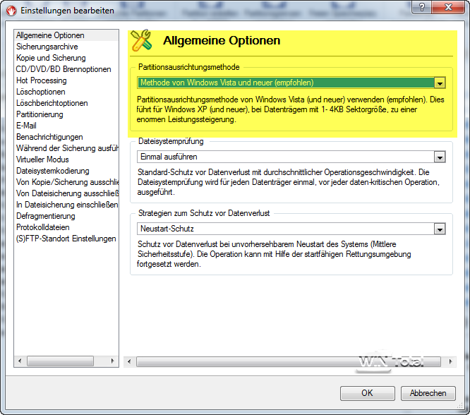 Stattdessen verfügt der Festplatten Manager über eine automatische Partitionsausrichtung, deren Arbeitsweise in den Einstellungen angepasst werden kann.