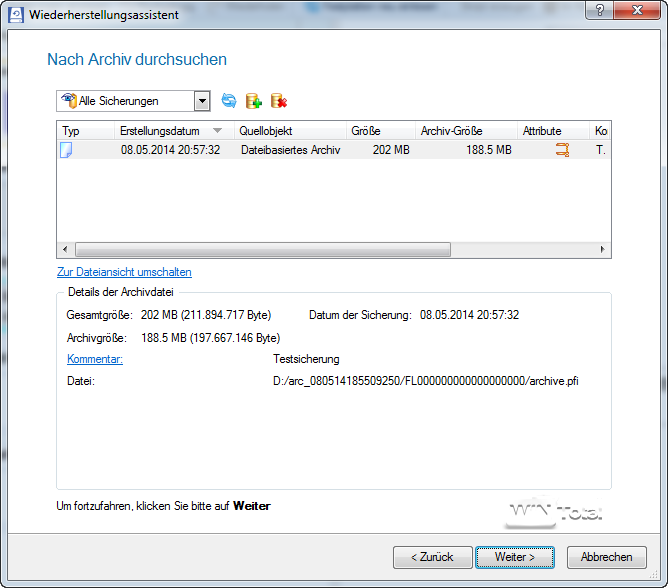 Auch für das Zurückspielen von Backups bietet ein Assistent seine Hilfe durch die Dialoge. Die Übersicht der gesicherten Backups ist aber für Dateibackups nicht so elegant gelöst, wie dies beispielsweise Acronis in True Image 2014 realisiert hat.