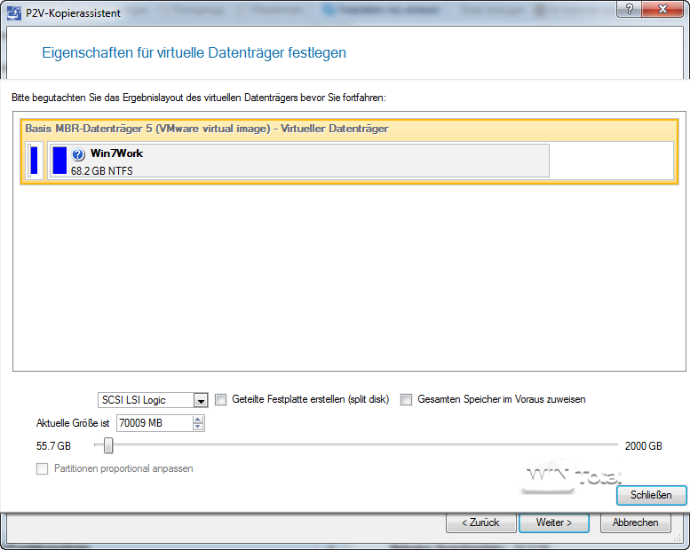 Die Migration von Systemen in eine virtuelle Maschine zählt auch zu den Aufgaben des Festplatten Managers. Mit P2V (P2V steht für “Physical-to-Virtual”) kann das laufende System in eine virtuelle Umgebung überführt werden. Der Anwender wählt die Partitionen aus, die Zielapplikation (VMWare, Virtual PC, Virtual Box) und gibt zuletzt noch ein paar Details an.Hyper-V wird derzeit noch nicht direkt unterstützt, kann aber über das Dateiformat VHD indirekt bedient werden.