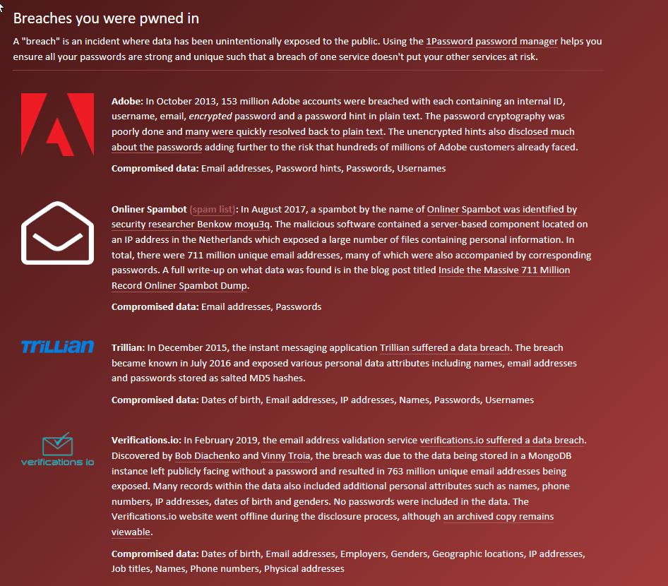 Dabei sind nicht nur kleinere Anbieter oder Foren wie BitTorrent oder vBulletin, sondern auch große Unternehmen, Dienstanbieter sowie MMO-Spiele wie beispielsweise Adobe, LinkedID, MySpace, Creative, Disqus, Dropbox, Knuddels, League of Legends, Malwarebytes, MyFitnessPal, Snapchat, Sony oder Trillian betroffen. Auf der Webseite haveibeenpwned.com können Sie abfragen, ob Ihre eigene Mailanschrift sich in über 9 Milliarden Datensätzen findet, welche von mehr als 400 Webseiten erbeutet wurden.