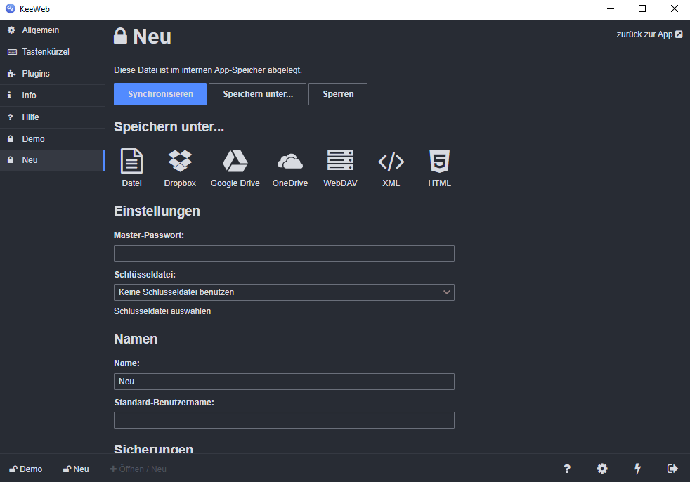 Als einziges Programm kann KeeWeb auch als Web-App über die URL https://app.keeweb.info/ gestartet werden, ist damit von überall aus nutzbar, sofern Sie Ihre Passwort-Datei immer dabei haben.