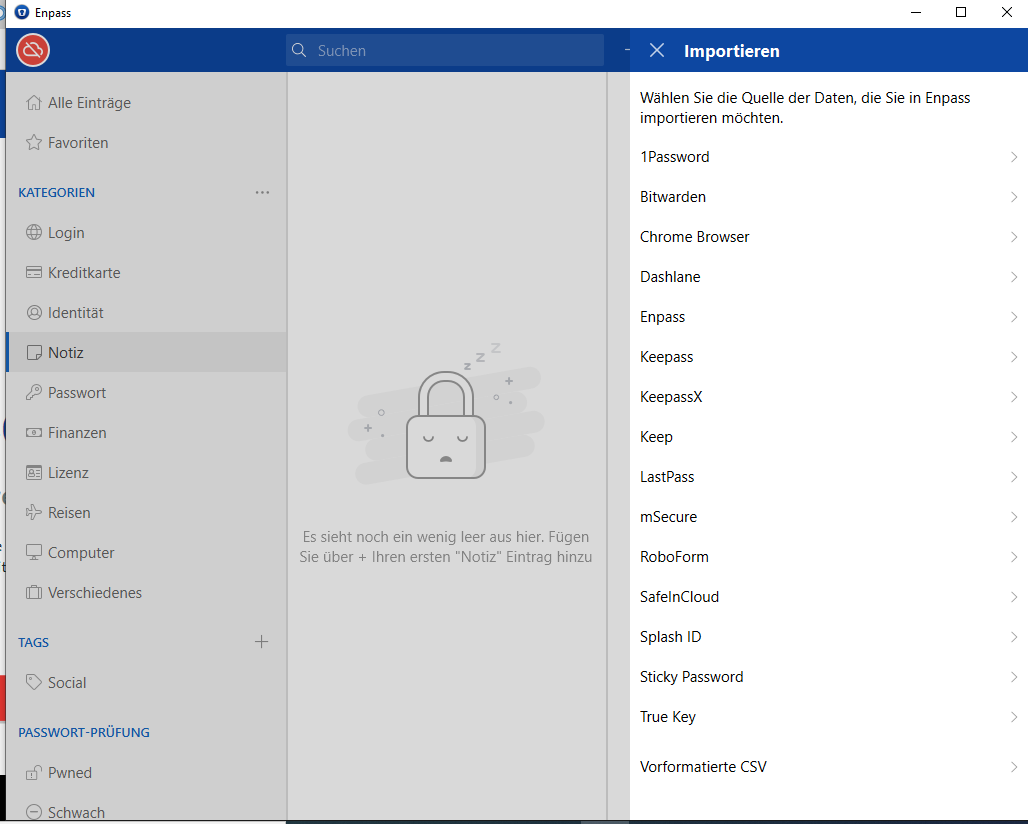 Der Passwort-Generator kann neben kryptischen Zahlenfolgen auch aussprechbare Sätze als Passwort generieren, welche aber nur in englischer Sprache formuliert sind. Als einziges Programm im Testfeld kann Enpass die Daten von so ziemlich jedem bekannten Passwort-Manager importieren. Für den Export stehen dagegen nur CSV, TXT und JSON zur Verfügung.