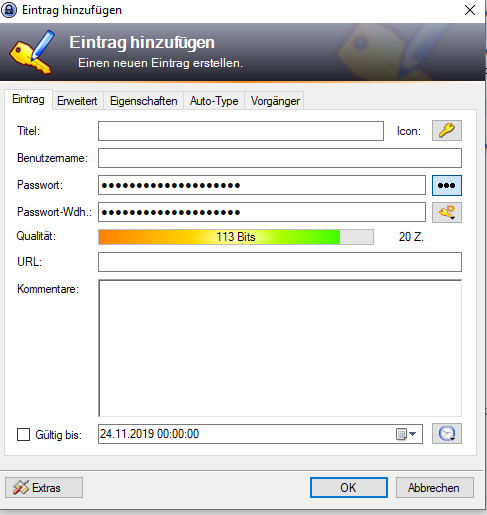 Für jeden neuen Eintrag gibt es mehrere Felder wie Titel, Benutzername, Passwort, Passwortwiederholung, URL der Seite sowie ein Kommentarfeld. Auch die Gültigkeit des Kennworts kann bei den meisten Programmen mit angegeben werden. Die Sicherheit des verwendeten Kennworts für Einträge zeigt KeePass direkt im Eingabefenster an.