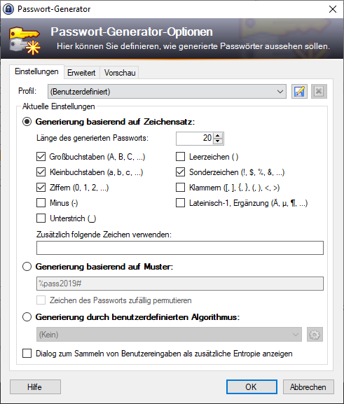 Ein integrierter Passwort-Generator erleichtert auch die Erstellung komplexer Kennwörter. Sie können beispielsweise bei KeePass auch angeben, ob bestimmte Zeichen oder Zeichenfolgen immer im Passwort verwendet werden sollen.
