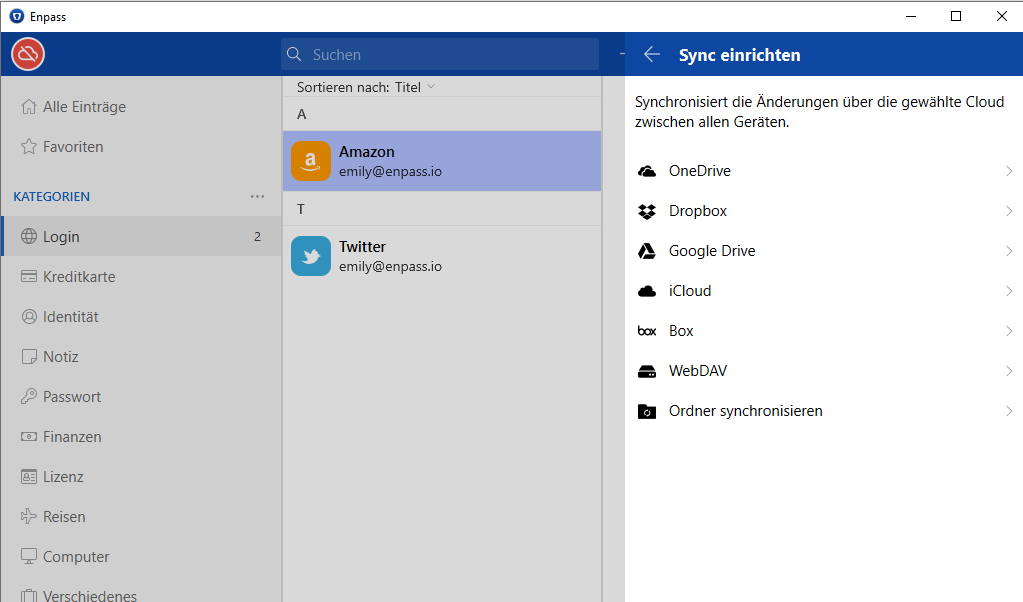 Der von seiner Darstellung her sehr moderne Enpass speichert seine Passwortdaten auch lokal, kann die Datei aber auch auf WebDAV oder einen Cloud-Speicher wie Dropbox und Co. ablegen und darüber synchronisieren.