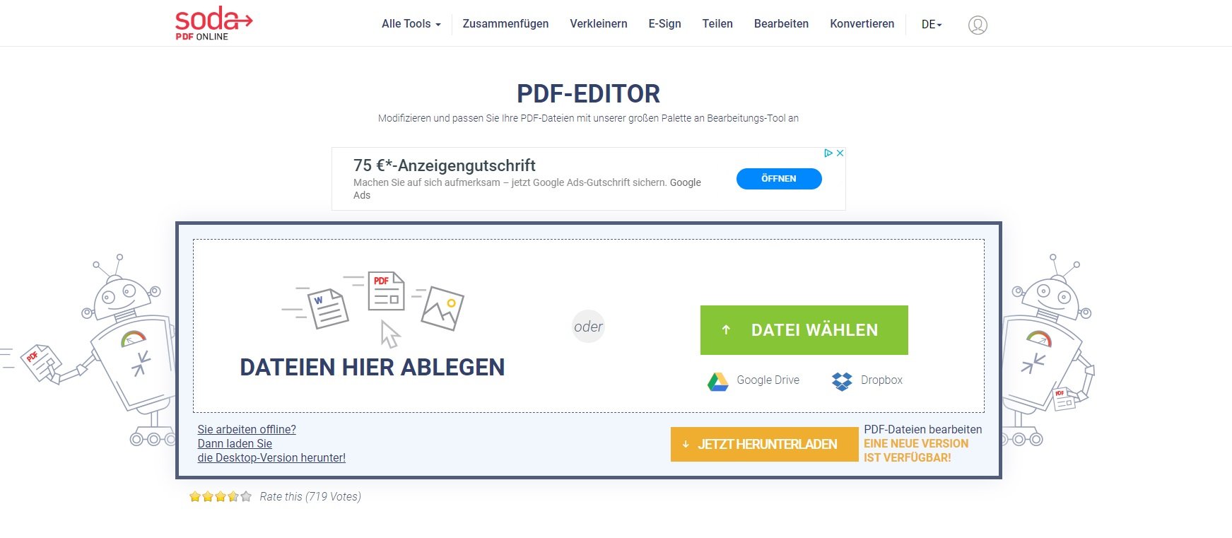 Die Kernfunktionen umfassen das Öffnen, Anzeigen, Drucken, Konvertieren und Zusammenführen von PDF-Dokumenten. Zudem können Sie damit unter anderem auch die Seiten neu anordnen, Änderungen vornehmen, Ergänzungen hinzufügen oder das Dokument mit einer digitalen Unterschrift versehen. Überdies verfügt Soda PDF auch über ein praktisches Tool zum Verkleinern von Dateien, was besonders für den Versand von Email-Anhängen äußerst hilfreich ist.